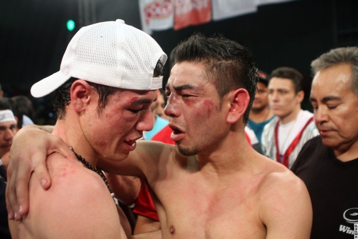 Временный чемпион мира по версии WBA 22-летний мексиканец Уго Руиз (на фото слева) и его 29-летний соотечественник Франсиско Арсе после состоявшегося вчера в Мексике поединка. После упорных и зрелищных двенадцати раундов, по ходу которых обоим боксерам отчитывались нокдауны, победу решением судей (114-109 дважды и 112-111) одержал Уго Руиз. (Фото BoxingScene.com)