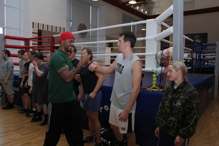 Вчера в Академии бокса (г. Москва, Лужнецкая набережная 24, стр. 4) состоялся мастер-класс экс-претендента на титулы чемпиона мира, американского супертяжеловеса Монте Барретта для клиентов клуба. В тренировке могли принять участие все желающие, и таковых оказалось немало. Самому юному любителю бокса всего 8 лет. Баррет провел полноценную тренировку, активно раздавал рекомендации и акцентировал внимание спортсменов на правильность выполнения упражнений. Участники смогли в полной мере ощутить атмосферу профессиональной американской боксерской подготовки. После тренировки все желающие смогли получить автограф боксера и сфотографироваться с ним.