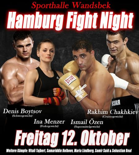 Очередной вечер бокса промоутерская компания Universum Box-Promotion планирует провести совместно с Hamburg Box-Promotion в Wandsbeker Sporthalle (cпоривный зал гамбургского района Вандсбек, максимальная вместимость — 2 300 зрителей ). На ринг выйдут не имеющий поражений российский супертяжеловес Денис Бойцов, олимпийский чемпион Рахим Чахкиев, экс-чемпионка мира Инна Менцер и другие боксеры.