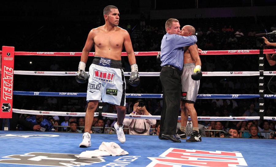 В минувшую субботу в США бывший обладатель титулов WBA, IBF и WBO в легком весе 29-летний американец Хуан Диас (36(18)-4(1)-0) провл поединок против бразильца Адайлтона Де Хесуса (30(24)-7(4)-0). С первой минуты боя Диас пошел в атаку, выбрасывая большое количество ударов, пока угол бразильца не отказался от продолжения боя и не выбросил полотенце в пятом раунде. (Фото: Chris Farina/Top Rank)