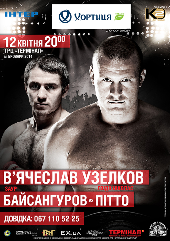 12 апреля в ТРЦ «Терминал» (Бровары, Украина) состоится первый в этом году боксерский турнир компании братьев Кличко «K2 Promotions». В этот вечер в ринг выйдет интернациональный чемпион по версии IBO в полутяжелом весе Вячеслав Узелков. Его соперником в рейтинговом поединке будет Геард Айетович из Сербии. В рамках боксерского турнира после долгого перерыва, связанного с травмой, свой поединок проведет экс-чемпион WBO в первом среднем весе Заурбек Байсангуров. Противостоять Заурбеку будет аргентинский боксер Гуидо Николас Питто. На кону будет стоять вакантный пояс чемпиона IBO в первом среднем весе.