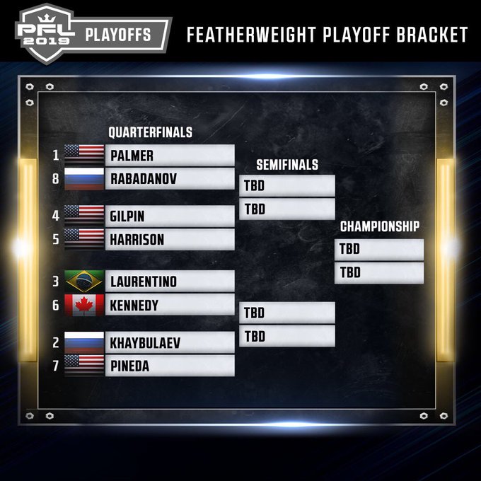 Компания PFL после серии сезонных турниров оценила достижения участников и объявила сетку турниров в двух весовых категориях. Два россиянина примут участие в Плей-офф из восьми участников в полулегкой весовой категории. Гаджи Рабаданов встретится с Лэнсом Палмером, и Мовлид Хайбулаев встретится с Даниэлем Пинеда.