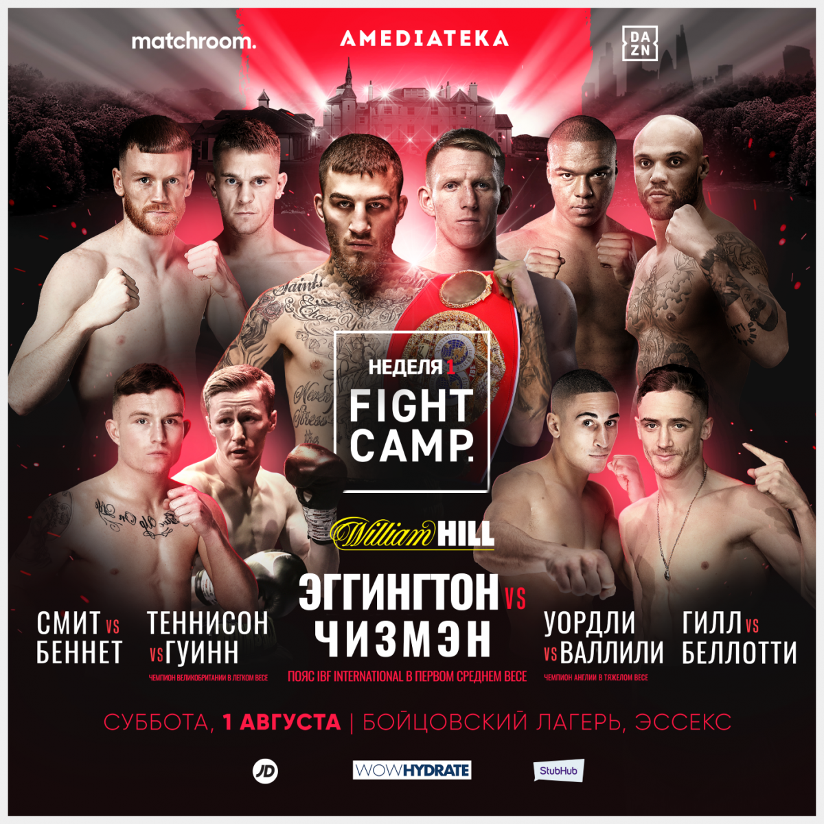Fight Camp завершится незабываемым вечером в субботу 22 августа, когда Диллиан Уайт (27-1, 18 нокаутов) защищает свой титул чемпиона мира по версии WBC в тяжелом весе против Александра Поветкина (35-2-1, 24 нокаута). В этот вечер тяжеловес Мартин Баколе (15-1, 12 нокаутов) возвращается на ринг против россиянина Сергея Кузьмина (15-1, 11 нокаутов), а Лютер Клэй (13-1, 5 нокаутов) защищает свой титул WBO в полусреднем весе против Криса Конго (11- 0, 6 нокаутов).
