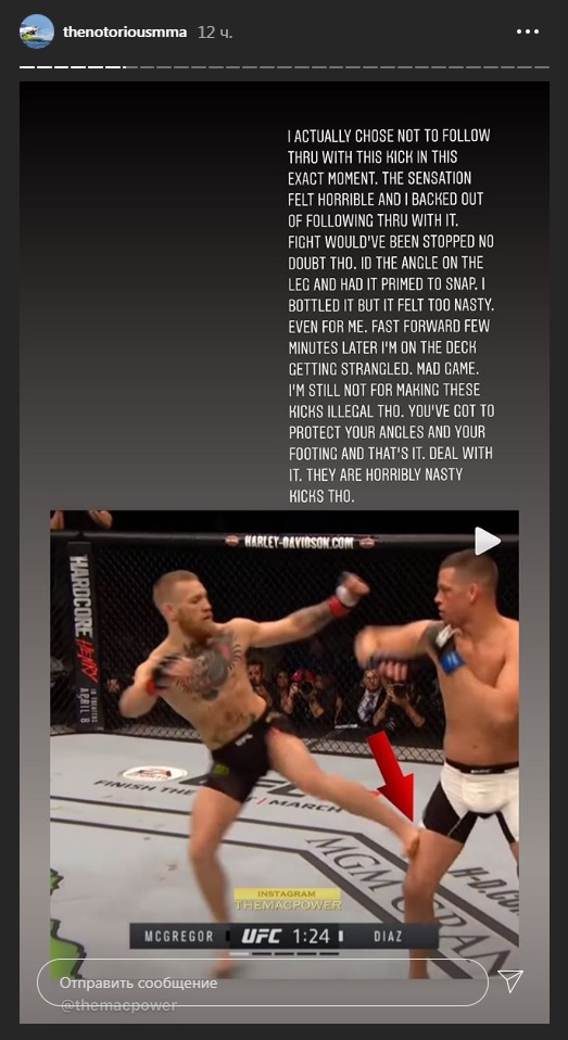 Экс-чемпион UFC в двух весовых категориях Конор Макгрегор рассказал о первом поединке с Нэйтом Диасом, в котором решил не атаковать колено Диаса ударом ногой, после которого связки колена могли бы повредиться настолько, что рефери остановил бы бой. В историях инстаграма Конор объяснил, почему это сделал.