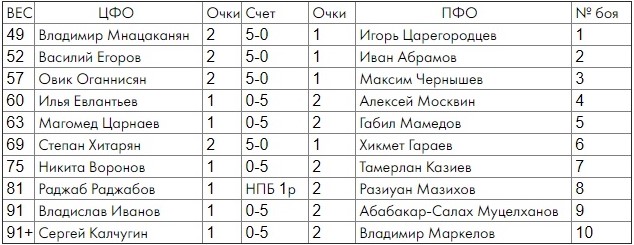Сегодня в Ижевске команда Приволжского федерального округа завоевала командный Кубок России, победив в финальной матчевой встрече команду Центрального федерального округа. Как во вчерашней встрече за третье место победитель определился в схватках в тяжелых весовых категориях. Матч завершился со счетом 15-15, и команда ПФО была признана победителем, так как ее боксер одержал победу в поединке в супертяжелом весе свыше 91 кг. Команда победитель получила 7 миллионов рублей, за второе место — 5 млн, а команда Уральского федерального округа получила 3 млн за третье место.