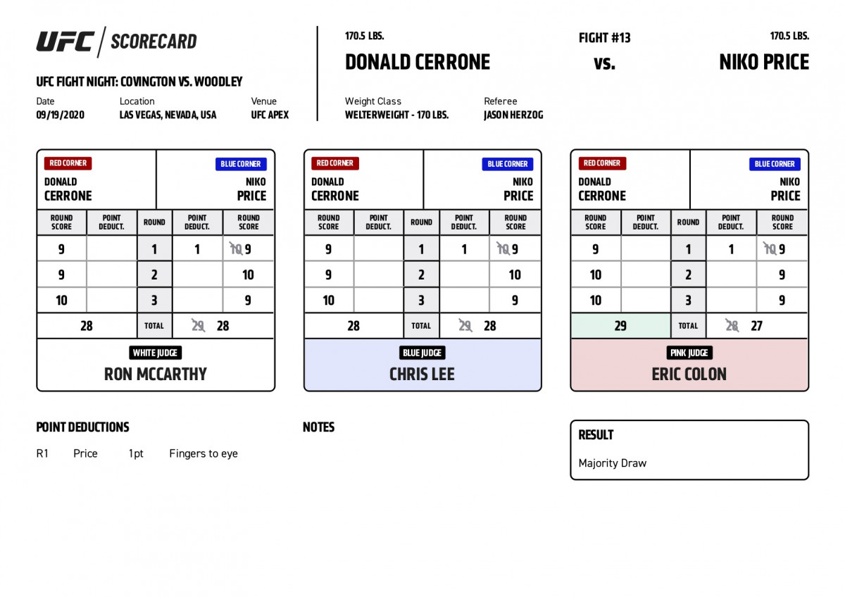 Бой Дональда Серроне и Нико Прайса на турнире UFC Vegas 11 не выявил победителя. Прайс с первых секунд боя бросился в атаку и уверенно вел первый раунд, но из-за тычка в глаза с него сняли балл. Второй и третий раунды прошли в равной битве, где оба были активны и много попадали.
