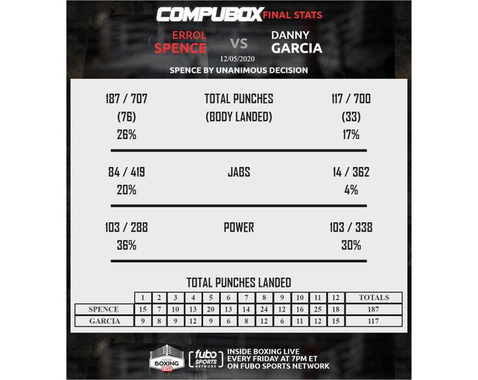 30-летний чемпион WBC и IBF в полусреднем весе Эррол Спенс успешно вернулся на ринг после долгого перерыва и восстановления от травм, полученных в автомобильной аварии, победив единогласным решением судей экс-чемпиона мира в двух весовых категориях Дэнни Гарсию 5 декабря в США, Поединок проходил в достаточно высоком темпе, и у Гарсии были успешные моменты, но в целом Спенс был активнее и контролировал большее количество эпизодов и победил со счетом 117-111 и 116-112 дважды.
