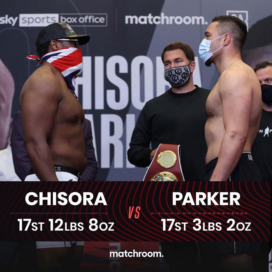 Сегодня в Манчестере, Великобритания состоялась официальная церемония взвешивания перед намеченным на 1 мая вечером бокса «Чисора-Паркер», в рамках которого чемпион WBA в полутяжелом весе Дмитрий Бивол (79 кг / 174,2 фунта) выйдет на ринг против британского боксера Крэйга Ричардса (79,2 кг / 174,6 фунта).