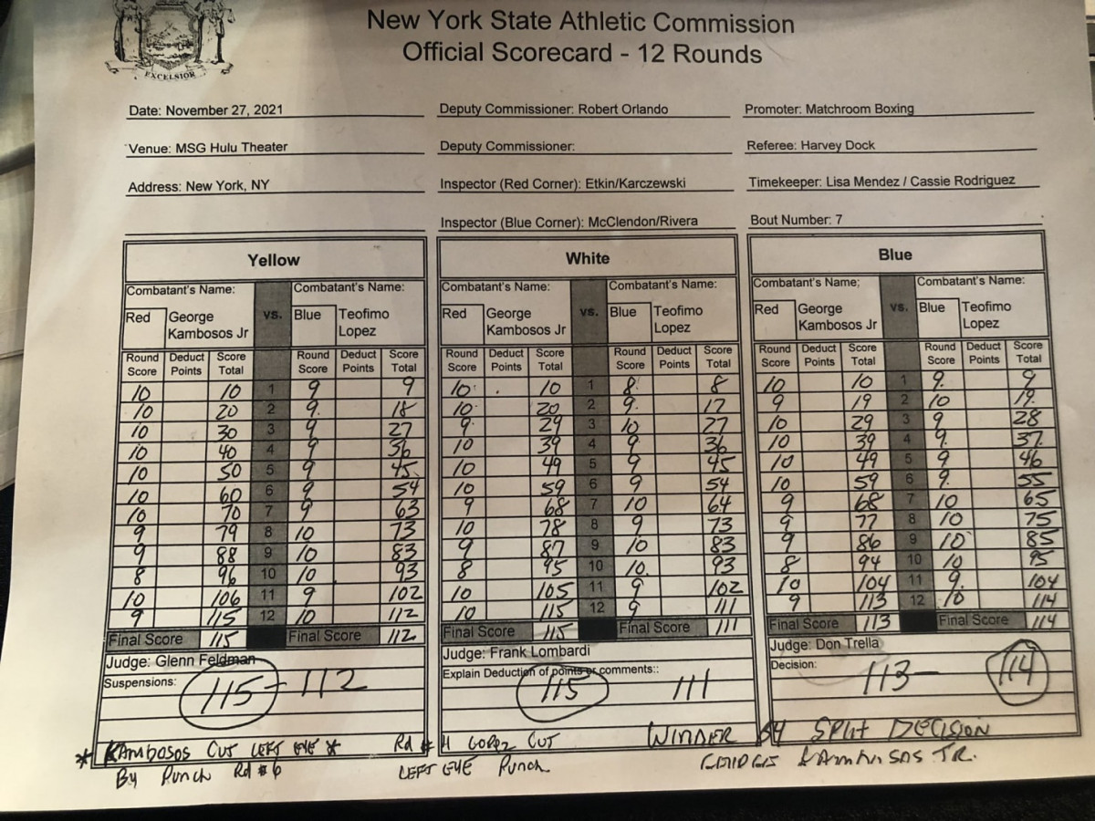 Судьи отдали победу Кэмбососу со счетом 115-111, 115-112 и 113-114. Согласно CompuBox, Кэмбосос нанес 155 точных ударов из 392 выброшенных, а Лопес — 115 из 281.