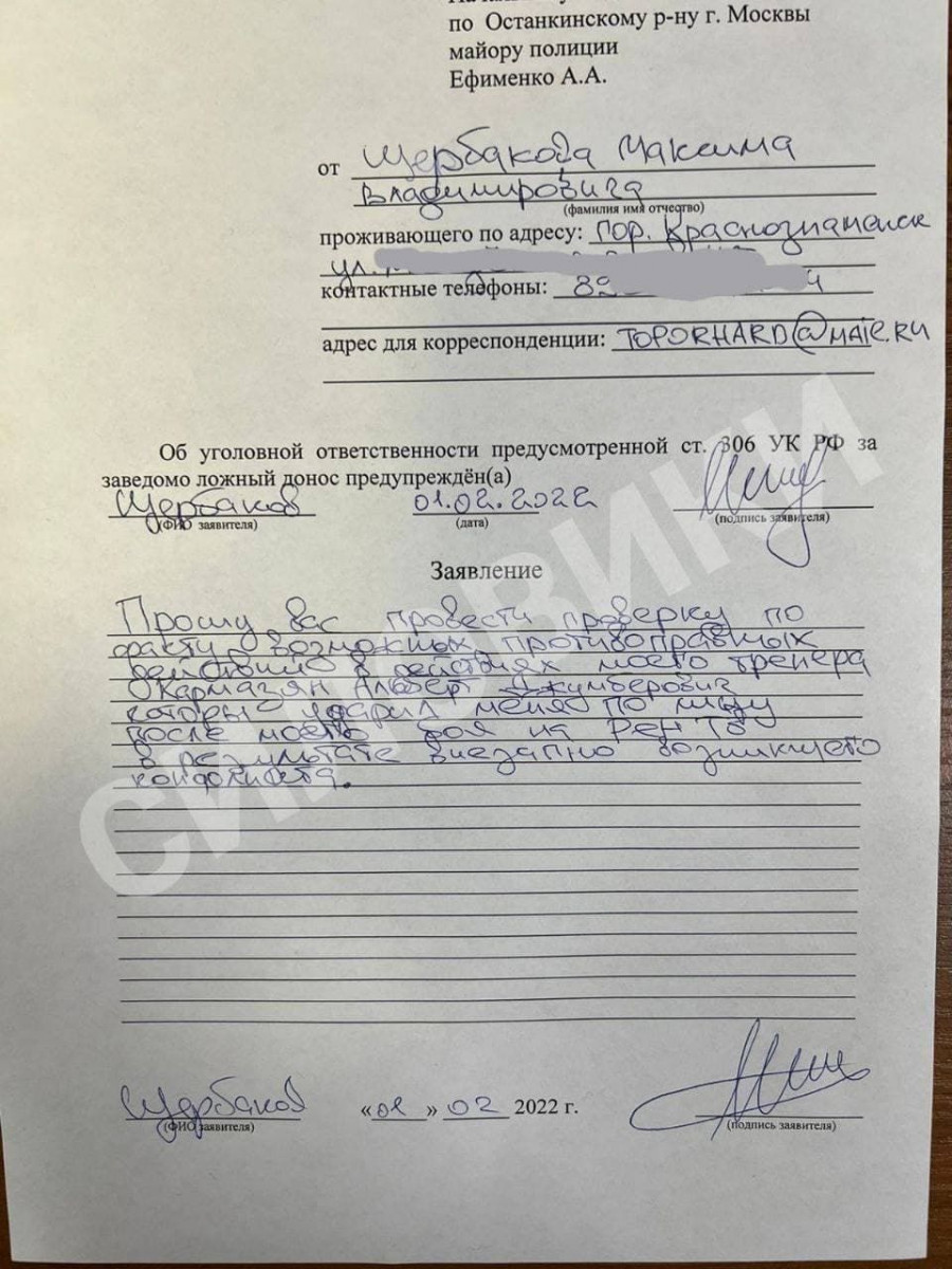 Спустя несколько дней после этого Щербаков обратился в полицию и написал заявление с просьбой проверки противоправных действий своего тренера по факту избиения.