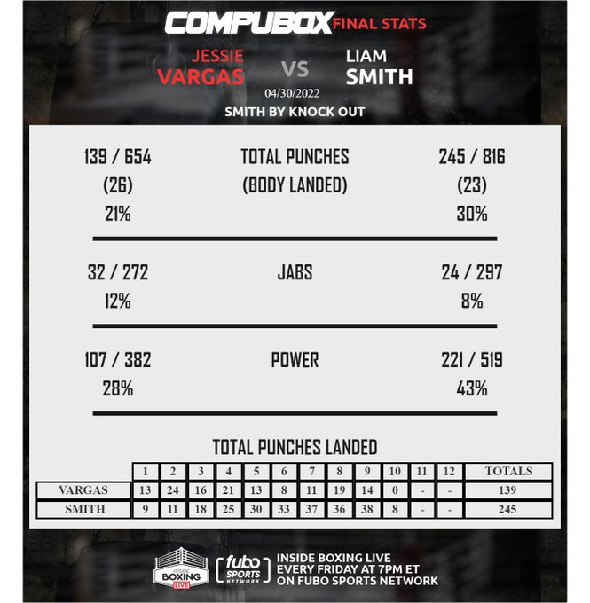 33-летний британец Лиам Смит одержал досрочную победу в десятом раунде над 32-летним американцем Джесси Варгасом в поединке двух экс-чемпионов мира 30 апреля в Нью-Йорке.