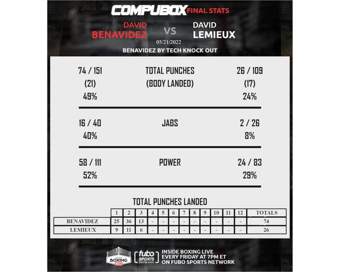 25-летний американский боксер Дэвид Бенавидес победил экс-чемпиона мира в среднем весе из Канада Давида Лемье техническим нокаутом в третьем раунде и стал временным чемпионом WBC во среднем весе.