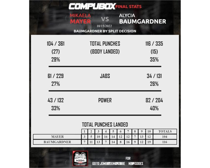 Чемпионка WBC в первом легком весе Алисия Баумгарднер одержала победу раздельным решением судей в объединительном поединке против обладательницы титулов IBF и WBO Микаэлой Майер 15 октября в большом женском вечере бокса в Лондоне на полностью заполненной O2 Арене.