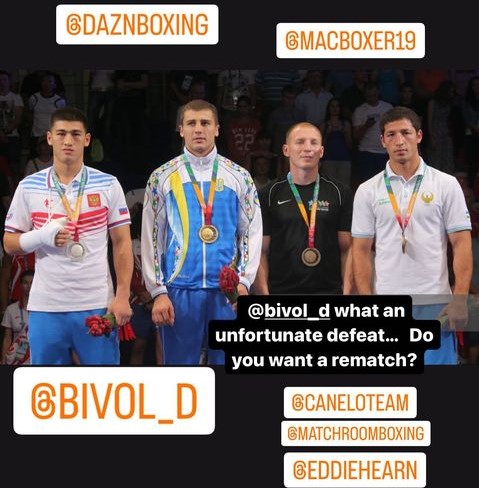 «Дмитрий Бивол, какое досадное поражение… Хочешь реванша?», — написал Гвоздик в соцсетях, сопроводив свои слова фотографией награждения победителей Универсиады в весовой категории до 81 кг.