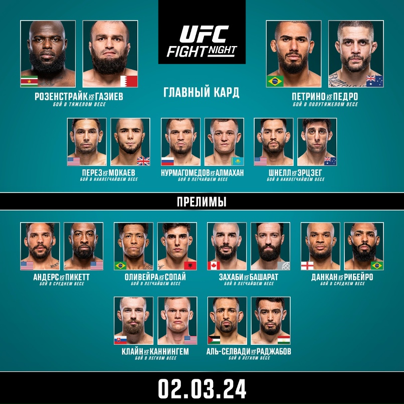 2 марта в Лас-Вегасе состоится шоу UFC FIGHT NIGHT 238. В главном бою шоу встретятся тяжеловесы Жаирзиньо Розенструйк и Шамиль Газиев. Также на шоу выступит россиянин Умар Нурмагомедов против казахстанца Бекзата Алмахана.