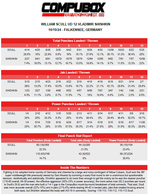 А американский судья Роберт Хойл отдал Скуллу пятый и восьмой раунды, в которых у него не было преимущества согласно статистике CompuBox.