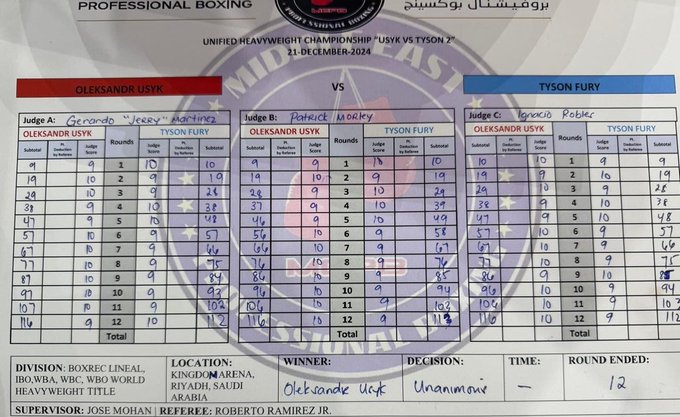 Интересно, что Энтони Джошуа, который не приехал в Эр-Рияд, оказывается внимательно следил за боем, и даже составил свою судейскую карточку для talkSPORT. У него Усик победил со счетом 115-114, так как последний раунд Джошуа не отдал никому.